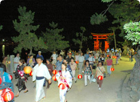 ちょうちん行列の人々はそれを見送った後、表参道を通り厳島神社へ向かい、お祓いを受けます。