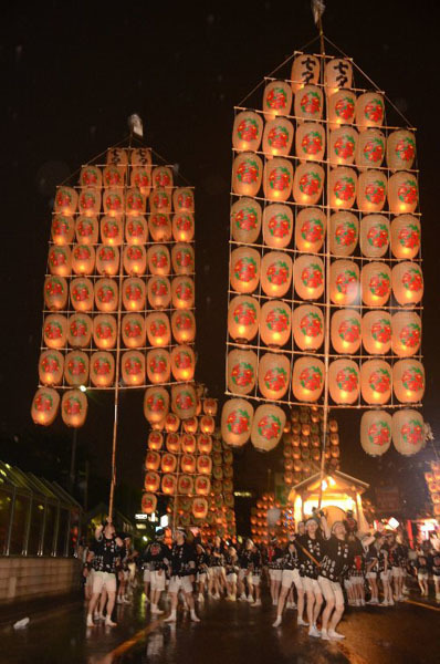 見所は手作業で作られた提灯、その提灯を飾る竹竿、軽々と持ち上げ観客をひきつける「差し手」と言われる男性です。