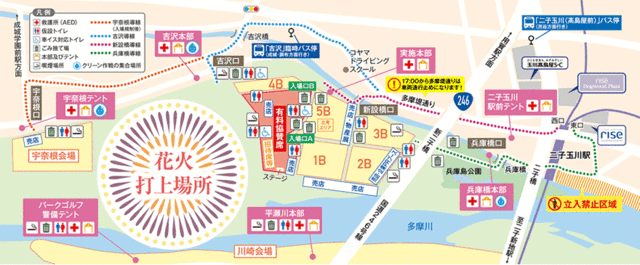 出典:www.tamagawa-hanabi.com世田谷区たまがわ花火大会の会場は、二子玉川駅から歩いて15分ほどのところにある世田谷区立二子玉川緑地運動場がメインとなります。