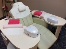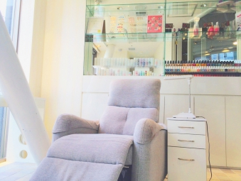 母は足を伸ばせるリクライニングチェアに座り、サービスのドリンクを飲みつつ、ネイルタイムをゆったり過ごせます。