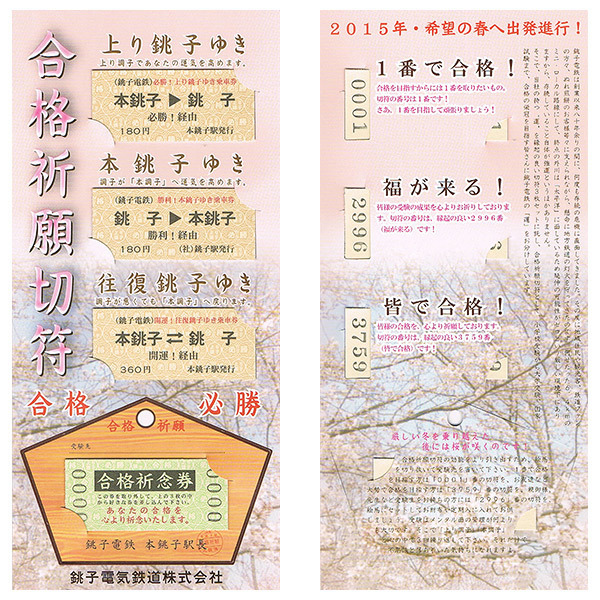 本銚子(駅名の読みは「もとちょうし」)が「本調子」につながることから、本銚子行き、本銚子発上り銚子行き、銚子⇔本銚子往復という、縁起のいい3種類の切符をセットにしたもので、中学・高校受験を控えた子どもに大人気のグッズです。