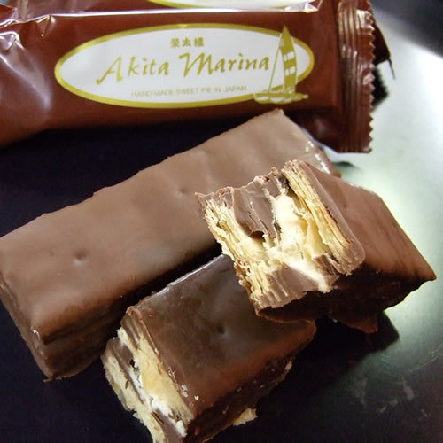 その洋菓子のひとつがこちら、「秋田マリーナ」。アーモンドパウダーが入ったクリームを、手焼きのサクサクのパイでサンドしたものを、さらにミルクチョコでコーティングしたお菓子です。ひとつでも十分食べごたえがあり、お茶との相性も抜群。