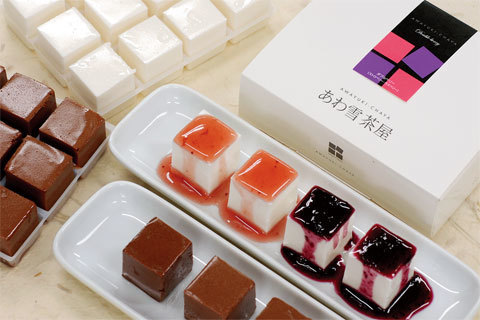 一口で食べられるキューブタイプのあわ雪、「あわ雪茶屋」も登場。ストロベリーとブルーベリーのソースをオシャレにかけていただく「ダブルベリー」。