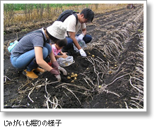 じゃがいも掘りは、8月中旬から10月上旬まで楽しめ、1区画1列約5m1,000円で収穫したものを全て持ち帰ることができます。