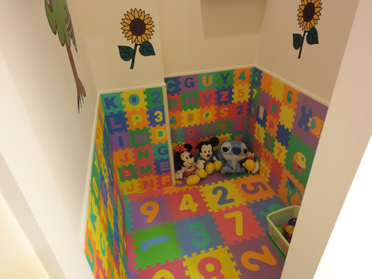 キッズスペースには、床だけではなく壁もマットで覆われているので、転んだり、ぶつかっても衝撃を弱めてくれるので、安心です。