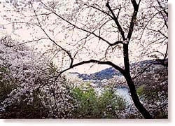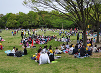敷地面積は11.6ヘクタールと、とても広く、公園内の池の周りには、春になると1,200本のソメイヨシノが咲き誇ります。湖面に映る桜がとてもきれいです。