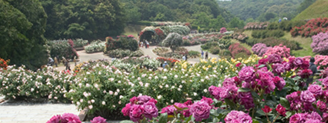 見どころは、珍しい植物を鑑賞できる2階建の広い温室や、季節に応じた草花が咲き誇る大花壇やバラ園です。