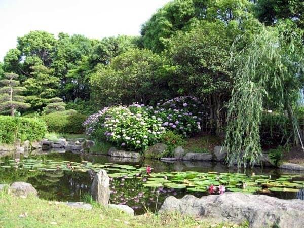 約30品種の花菖蒲が3000株も植えられていて、その花の数は約1万本にも及ぶので、見頃を迎えた園内は見ものです。アジサイやスイレンなども植えられています。
