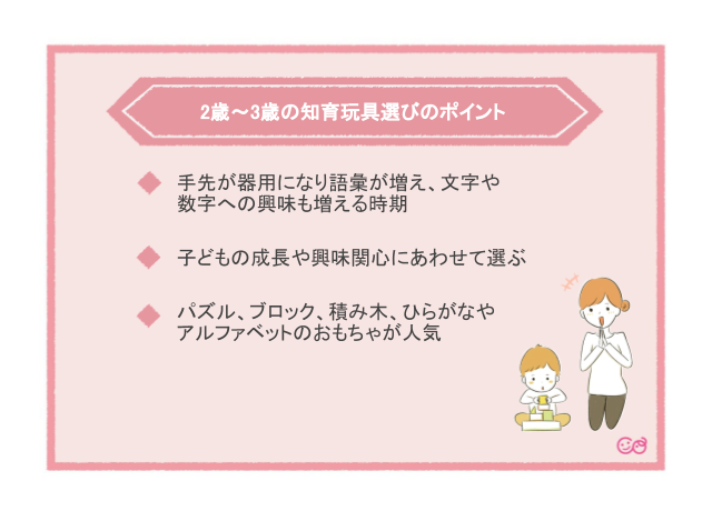 2~3歳向けの知育玩具をご紹介しました。いかがでしたでしょうか?知育玩具と言っても手先を動かすものや、歌や言葉を覚えられるものまでさまざまな種類のものがありますね。