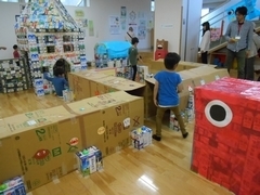 牛乳パックで作られた大人も乗れちゃう4人乗りの車や、迷路なんかもあります。回転ずし屋さんや、ドーナツ屋さんなど手作りのお店屋さんごっこができますよ。