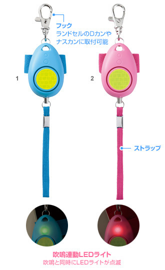 フックチェーンとベルトで、ランドセルやレッスンバッグなどにしっかり固定できます。ピンを抜く、あるいはボタンを押すと大音量のアラームが鳴ります。