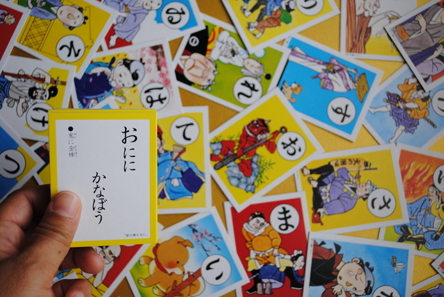 まだ文字を覚えてない時期でも絵をみながら文字も一緒に覚えられると言う一石二鳥な遊びが「かるた」です。