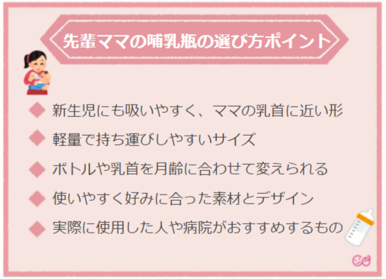 実際に使ったことがある家族や先輩ママ、産まれた病院の先生や助産師さんから、使って良かったポイントや哺乳瓶を選ぶ際の注意点など、経験や実績に基づいて教えてもらえると心強いですよね。