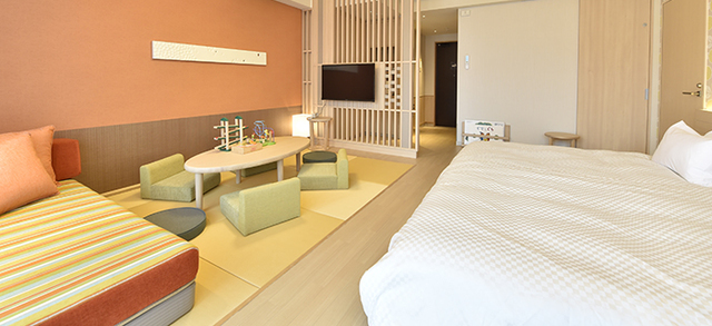 コテージタイプのお部屋はすべてフローリングで、ホテル棟のお部屋には畳のスペースがあるので、赤ちゃんのハイハイにも安心です。