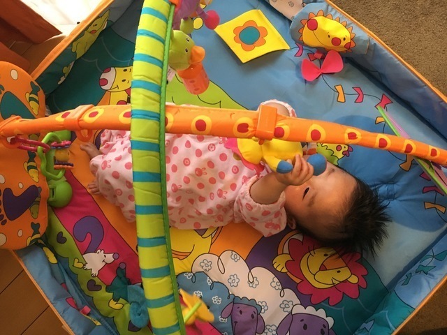 元気よく手足を動かしているうちに、おもちゃに触れて、音がなったりするので、声を出して喜びます。機嫌が悪い時にこれをやると、すぐにご機嫌になりました。