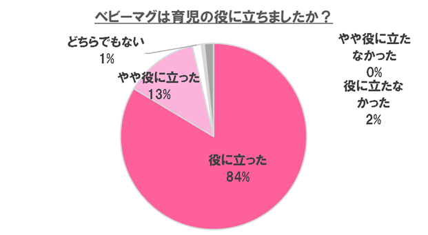 入手した方に聞いてみると、「役に立った」「やや役に立った」をあわせると97%。一方、「役に立たなかった」「やや役に立たなかった」をあわせると、2%。ほとんどの方が育児の役に立ったと評価しています。