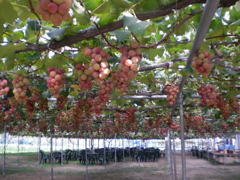 シーズンになるとぶどう狩りをしながら寛ぐ家族連れでにぎわっています。今年は10月中旬までの開園予定です。