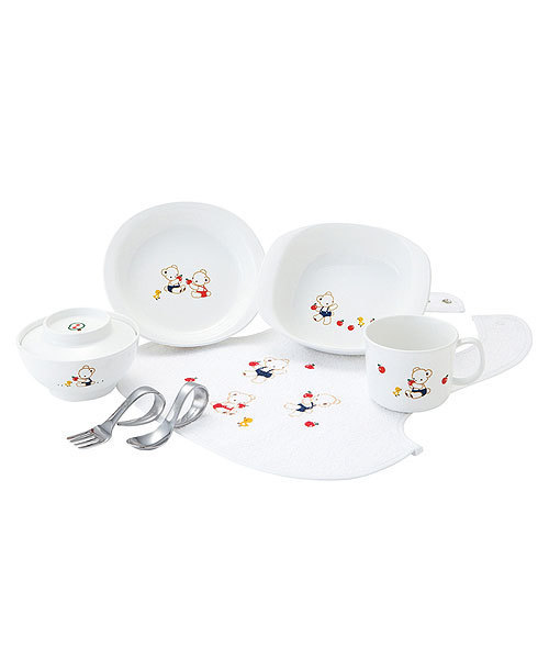 茶碗・マグ・深皿・浅皿・スプーン・フォーク・エプロンがセットとなっていて、離乳食初期から長く使うことができます。