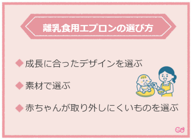 離乳食で使われるエプロンには、さまざまなデザインがあります。使う時期に合わせて、赤ちゃんが快適に使えるデザインを選びましょう。