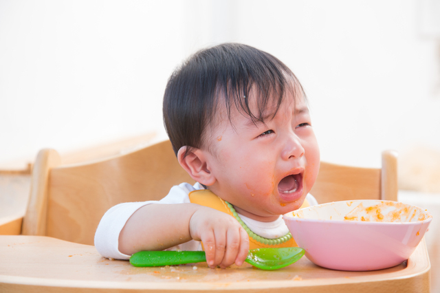 離乳食初期は、エプロンを着ける以前に、まだ離乳食に慣れず、食べることに抵抗を感じている赤ちゃんもいます。そんな時は、食器やスプーン、エプロンなどを、赤ちゃんが好きなキャラクターやモチーフのデザインを選んでみるなど、まずは食事が少しでも楽しくできることを優先に考えていきましょう。