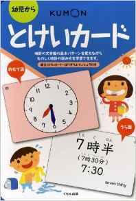 そこでオススメするのが、とけいカードです。表側には、時計の絵が描かれています。裏側には、日本語読みが感じで書かれていて30分の事を半と書いて読み方を教えられます。