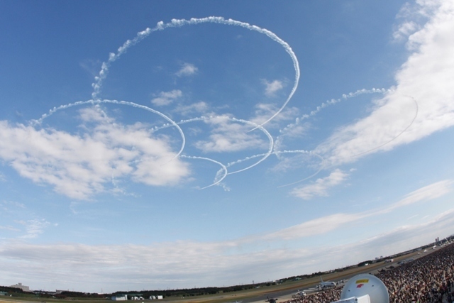 ブルーインパルスとは、数年前にドラマでも有名になった飛行隊の名称です。航空祭などで、派手なアクロバット飛行を披露する専門のチームのこと。大空で展開されるフォーメーション飛行は圧巻です。