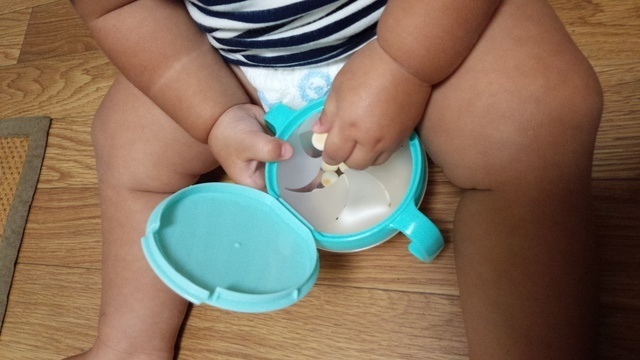我が家はボーロや赤ちゃんせんべいや野菜せんべいを一口サイズに切っていれてます。取り出すのにひと手間かかるので、赤ちゃんがお菓子を一気に食べてしまわなくて適度に時間がかかって良いです!!