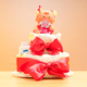大きさは直径20cm×高さ40cmで、一つ一つ丁寧にオムツやおもちゃを組み合わせて可愛いケーキの形にしているギフトです。