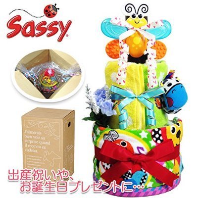 【出産祝い・プレゼントに喜ばれるベビー用品(1)】おむつケーキ Sassy 豪華3段5点ウォッシュタオルセット