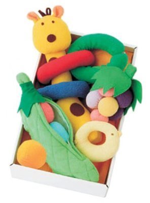 赤ちゃんの目を引くカラフルな動物やお野菜のおもちゃ、赤ちゃんのお気に入りにしてもらえそうですね。