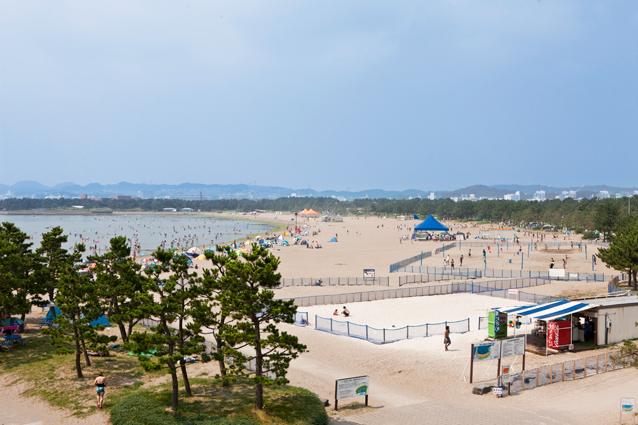 遠浅の海で砂浜に押し寄せる波がとっても穏やか。砂浜はいつでも管理され、キレイな状態を保っているので、小さなお子さんが海水浴デビューをするにはピッタリの場所です。