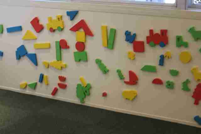 窓の下側の壁一面がマグネットになっていて、色々な色、かたちのマグネットをはずしたりつけたりして遊んだりできます。