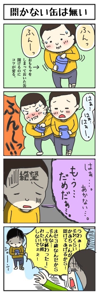 たかだか缶が開かないくらいで、そんな悲しい顔しないでよ〜。そのくらい母ちゃんが開けるよー。