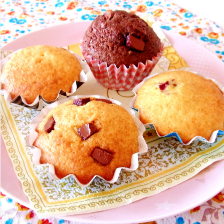プレーン、チョコチップ、ブルーベリー、ココアの4種類のマドレーヌが作れます。ココア以外は、生地をマドレーヌ型に入れたあとにチョコやジャムをのせるだけ。混ぜる手間がいらないので簡単です。