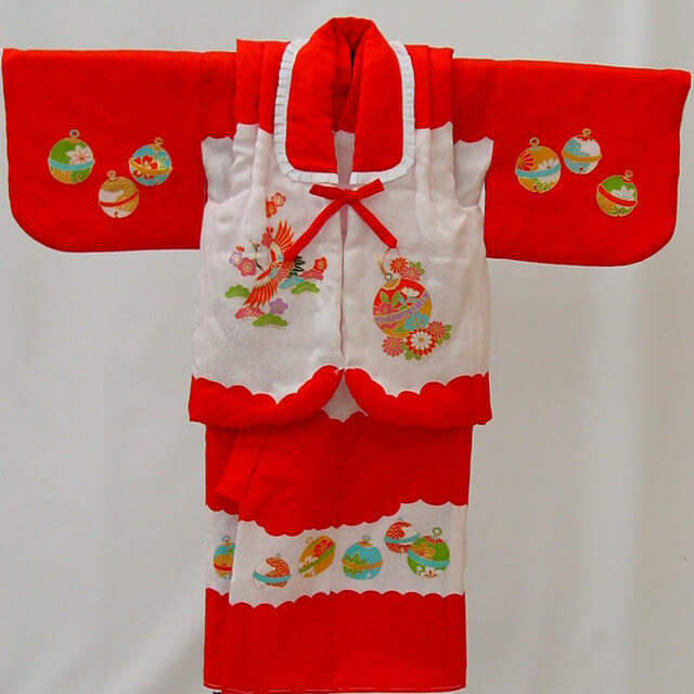 まずは、フル装備の和装。肌着の上から一つ身の着物を着て、その上に掛け着をするタイプ。地方によっては、着物の上に綿の入ったちゃんちゃんこのようなものを着てから、掛け着をすることもあります。