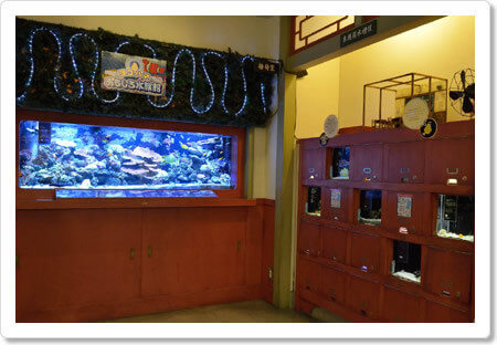 これをよく見てみるとあちらこちらに小さな水槽が埋まっていて魚が展示されているスペースがあり、来場者はワクワクしながら進む事が出来ます。