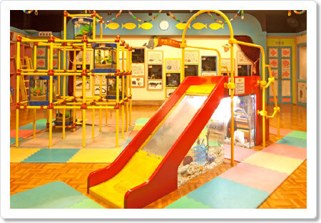 さらに、水槽が組み込まれたオリジナルの滑り台やジャングルジムがあり、元気に遊びながら子どもと一緒に間近で魚の様子を観察する事ができます。