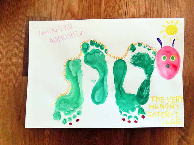 こちらは子どもも大好きで、足形アートでは定番のキャラクターはらぺこあおむし。