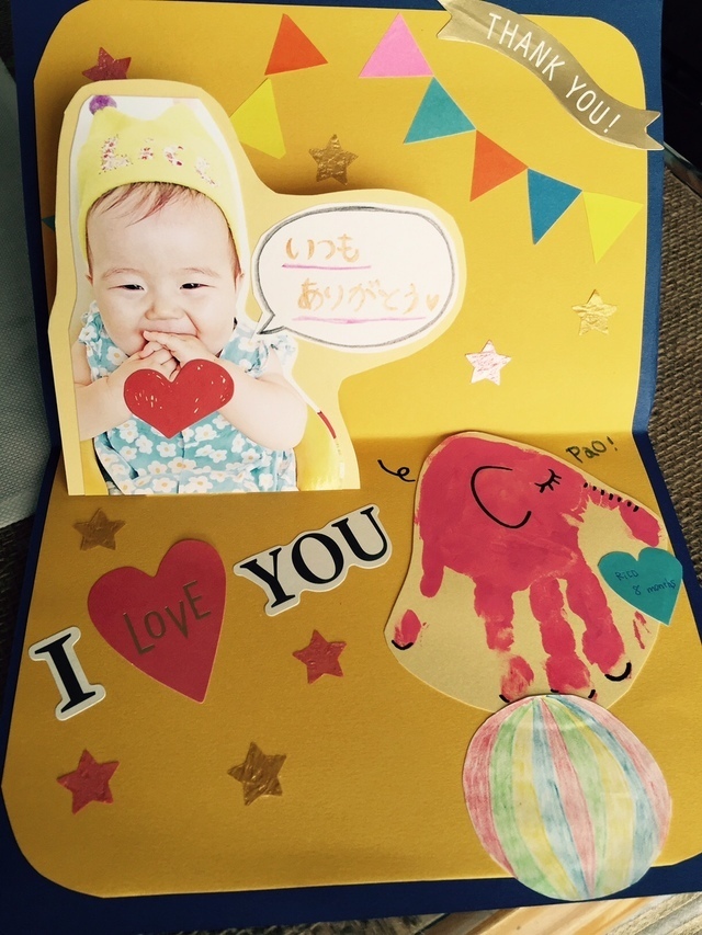 こちらはおじいちゃん、おばあちゃんに贈った飛び出すカード。子どもの写真と手形をつけました。