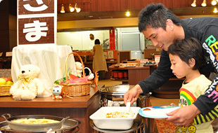 また、バイキングにはキッズコーナーが別で設けてあり、子どもが取りやすいよう、台が少し低くなっています。子どもが大好きなポテトやハンバーグなど定番の料理はもちろん、手の込んだ、動物の形をした手巻き寿司などもあり子どもが喜ぶものばかりです。