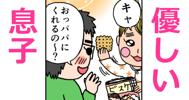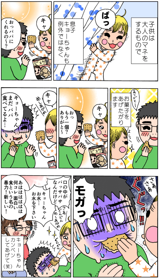 ビスケットを許容量を越えてパパに食べさせようとする息子,育児,子ども,食べさせ方