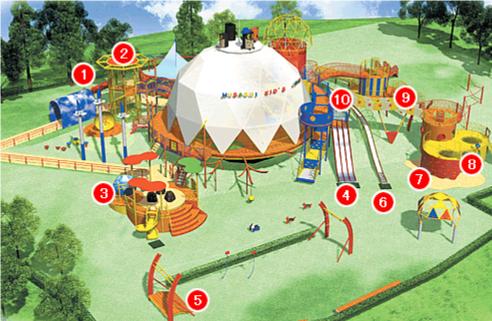 ドームの周りには様々なスライダー(滑り台)やウォールクライム、ロープウェイなどがあり、小さい子どもも楽しめる遊具がいっぱいです。