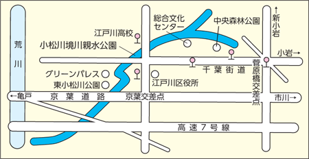 最寄り駅はJR総武線の新小岩駅になりますが、少々歩きます。駅から江戸川区役所前や森林公園前といったバスが出ているため、子連れファミリーやベビーカーの方はバスを利用した方が楽だと思います。