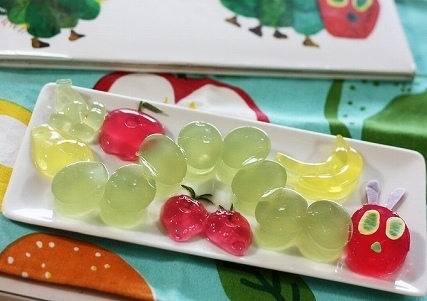 なかなかすっきり使い切ることができないかき氷のシロップと寒天で、子どもに絶大な人気を誇る絵本、はらぺこあおむしの寒天ゼリーを作りました。