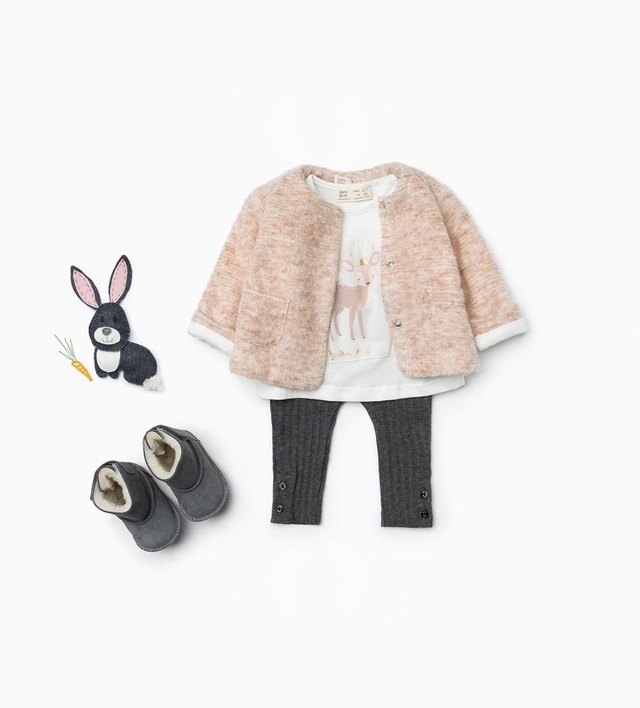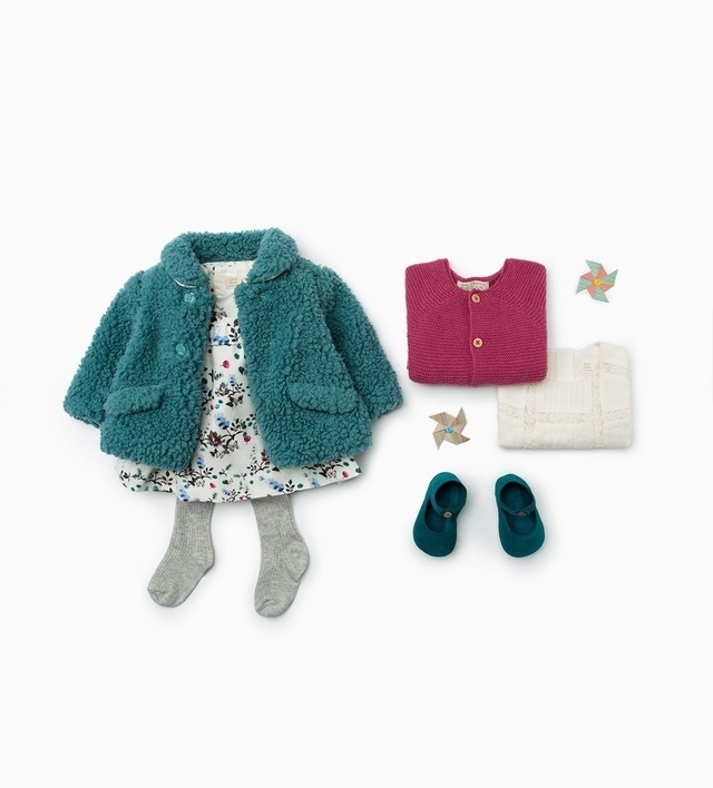 出典:www.zara.comもこもこがかわいい七分袖フリースコートは、ブルーグリーンで落ち着いた色です。子ども用の服は、どうしても原色系の派手な色になりがちです。