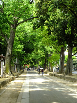 その歴史を感じさせる約2kmある、ケヤキの木々が並ぶ参道があります。神々しい自然の中での参拝は来る人の心が洗われえるような、すがすがしい気持ちにさせてくれますよ。