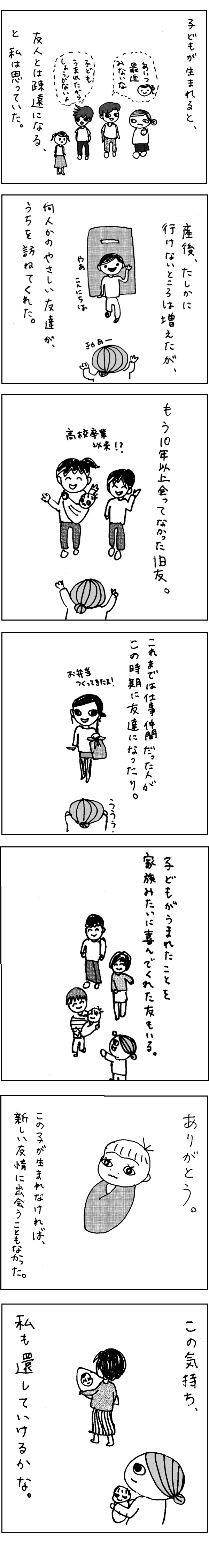 (14)母になってできる深い友ーこれまで友達じゃなかった人ともー前回、ママ友の話を描きましたが、ママになると、昔の友人関係のなかでも、ほんとうに「同志」「仲間」「ほんとうの友達」と呼べるような友達が、出来る気がします。それは、本当に困ったときに、手を差し伸べてくれる人が、誰なのか。がわかったりもします。このときに、助けてくれた友達との絆は、深い。たとえ、会う機会が少ないとしても、それは信じられるなあと思います。この記事に関連するリンクはこちらfacebookのにこたまコミュニティです。ぜひご参加ください。にこたまの公式HPですまとめそして、私もこの気持ちを誰かに返して行きたいなあ・・・と思っています。この記事に関連するリンクはこちらfacebookのにこたまコミュニティです。ぜひご参加ください。にこたまの公式HPです【育児マンガ】はたらく母さんの日々。『にこたま』|バックナンバー ・掲載内容や連絡先等は、現在と異なる場合があります。・表示価格は、改正前の消費税率で掲載されている場合があります。ご了承ください。 関連記事 【育児マンガ】はたらく母さんの日々。『にこたま』|(22)抜け毛フィーバー みっきーあらなわ 【育児マンガ】はたらく母さんの日々。『にこたま』|(13)ママ友できるかな みっきーあらなわ 【育児マンガ】はたらく母さんの日々。『にこたま』|(20)たそがれこわい みっきーあらなわ 関連するキーワード はたらく母さんの日々。『にこたま』