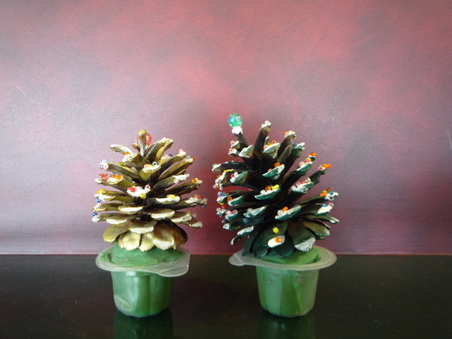 作り方は至って簡単。松ぼっくりにアクリル絵具で色を塗ります。ビーズやラメ、小さなポンポン、リボンなど(100均の手芸コーナーで購入できます)を接着剤でとめていけば、もうできあがり。