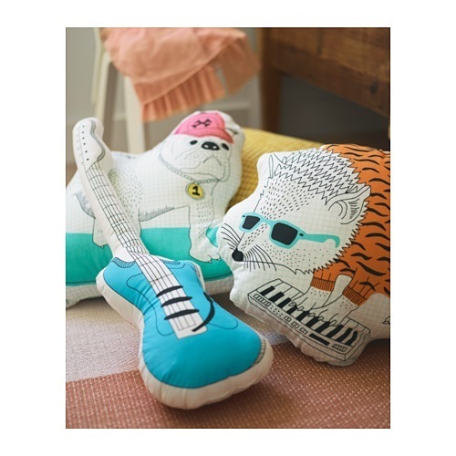 ハリネズミ、ブルドッグ柄、ギター柄もすべて999円。動物好きな子にはハリネズミやブルドッグ柄を、音楽好きな子にはギターをと、兄弟で違う柄のクッションを配置するのもかわいいかもしれませんよ。