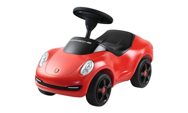 画像の赤いポルシェは、1歳半から3歳位の子ども用のベビーポルシェ、こちら以外にもペダルの付いた「911カレラ ペダルカー」、5歳以上の未来のレーサー向きゴーカートなどが正規ショップでは購入可能。